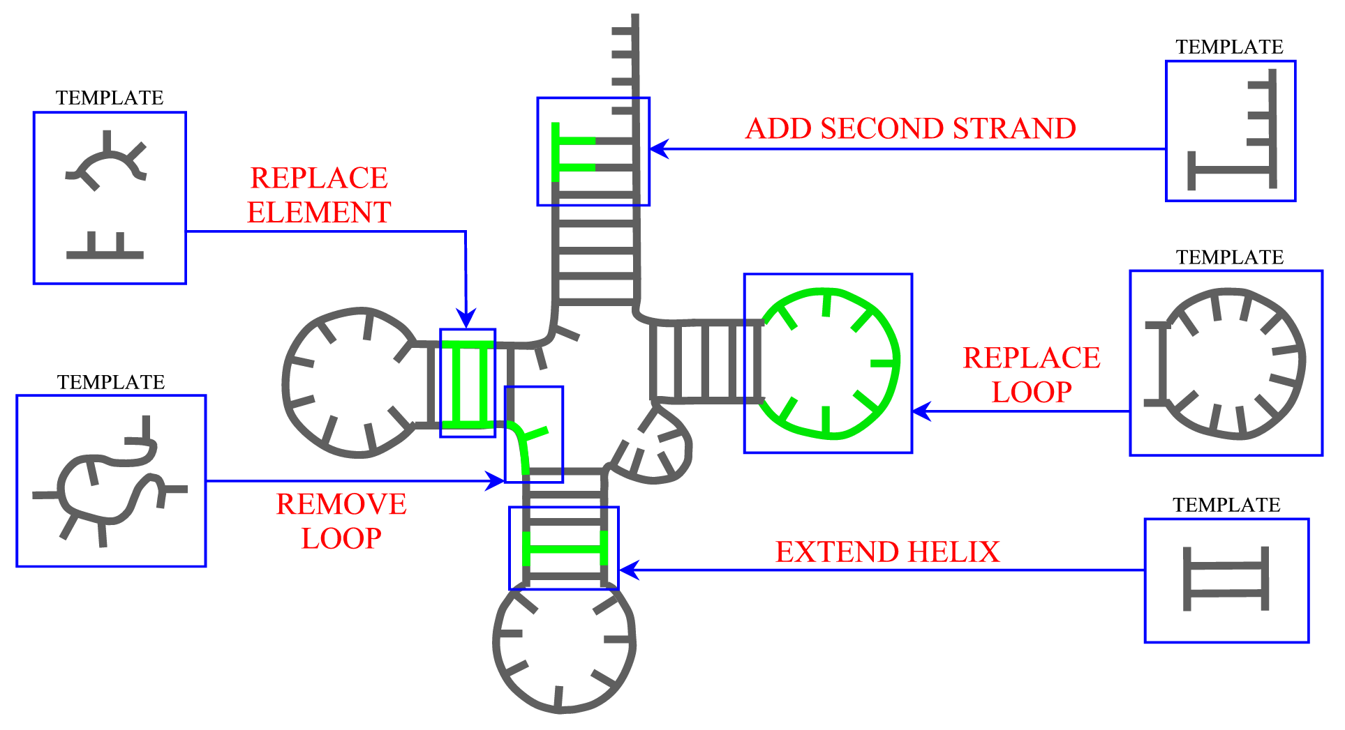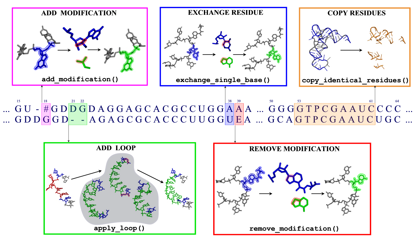 A complete list of modification names and abbreviations can be found in Modomics or in the file > Target containing several modifications as one-letter abbreviations ACUGUGAYUA[U UACCU#PG > Template containing the modification 015U GCGGA----UUU015UALCUCAG For adding modifications to standard bases, a set of 67 small fragments has been created. Each such fragment contains atoms belonging to a modification, and a triple of connecting atoms which are used to fit the fragment to an existing standard base. These connecting atoms are given in the data/modification_rules file. For removing modifications, a list of atom names which are to be removed is given in the same file. Recognition of modified nucleotidesThe recognition of modified bases is done in two steps: First, if the name of a residue is one out of A,G,C, or U, it is checked whether all and only the atoms for this nucleotide are present. Otherwise, it is assumed that this base is modified. In the second step, modified bases are detected by matching subgraphs in the molecular topology of that residue. For all modifications, such subgraphs have been defined in a SMILE-like notation in such a way, that all of them can be unambiguously distinguished. Loops